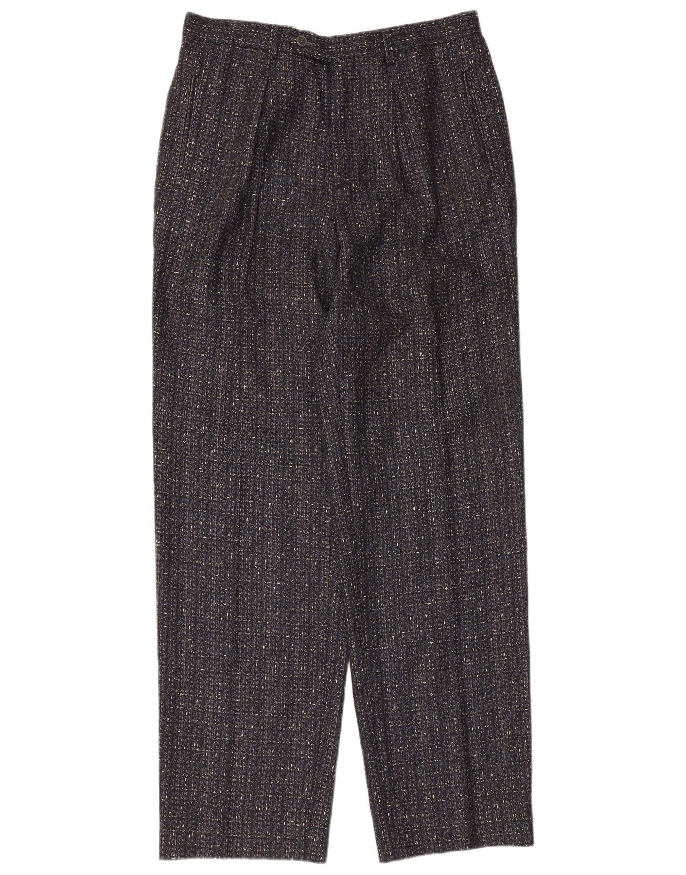 - Descripción de IA: Estos pantalones Vintage para hombre están confeccionados con una rica mezcla de lana y ofrecen un acabado texturizado y jaspeado. La tela multicolor presenta sutiles motas de negro, azul marino y gris. Presentan un frente plisado clásico y un cierre de cremallera seguro. El corte regular y las perneras rectas crean una silueta cómoda y atemporal. Prácticos bolsillos completan el diseño, combinando funcionalidad con estilo clásico.