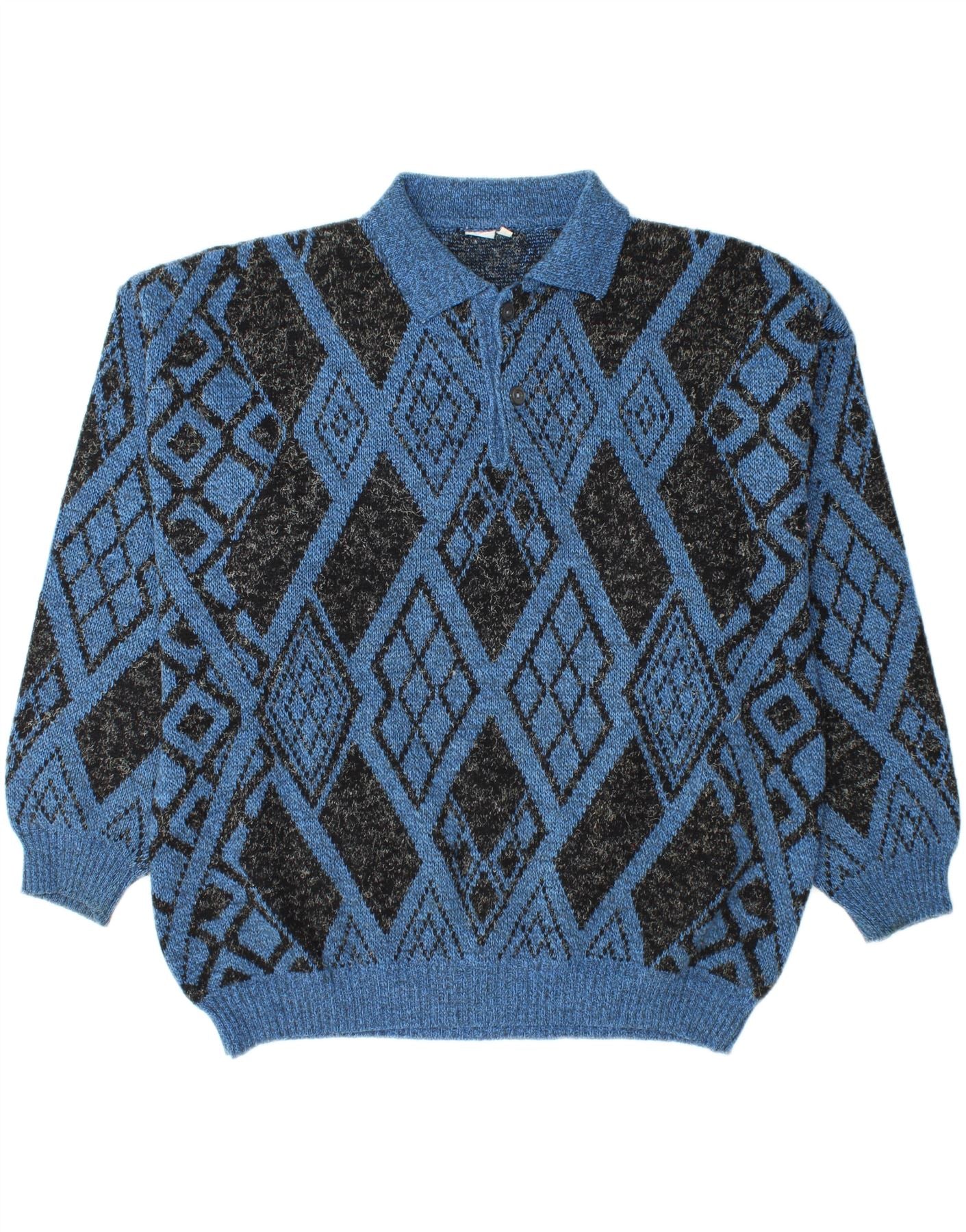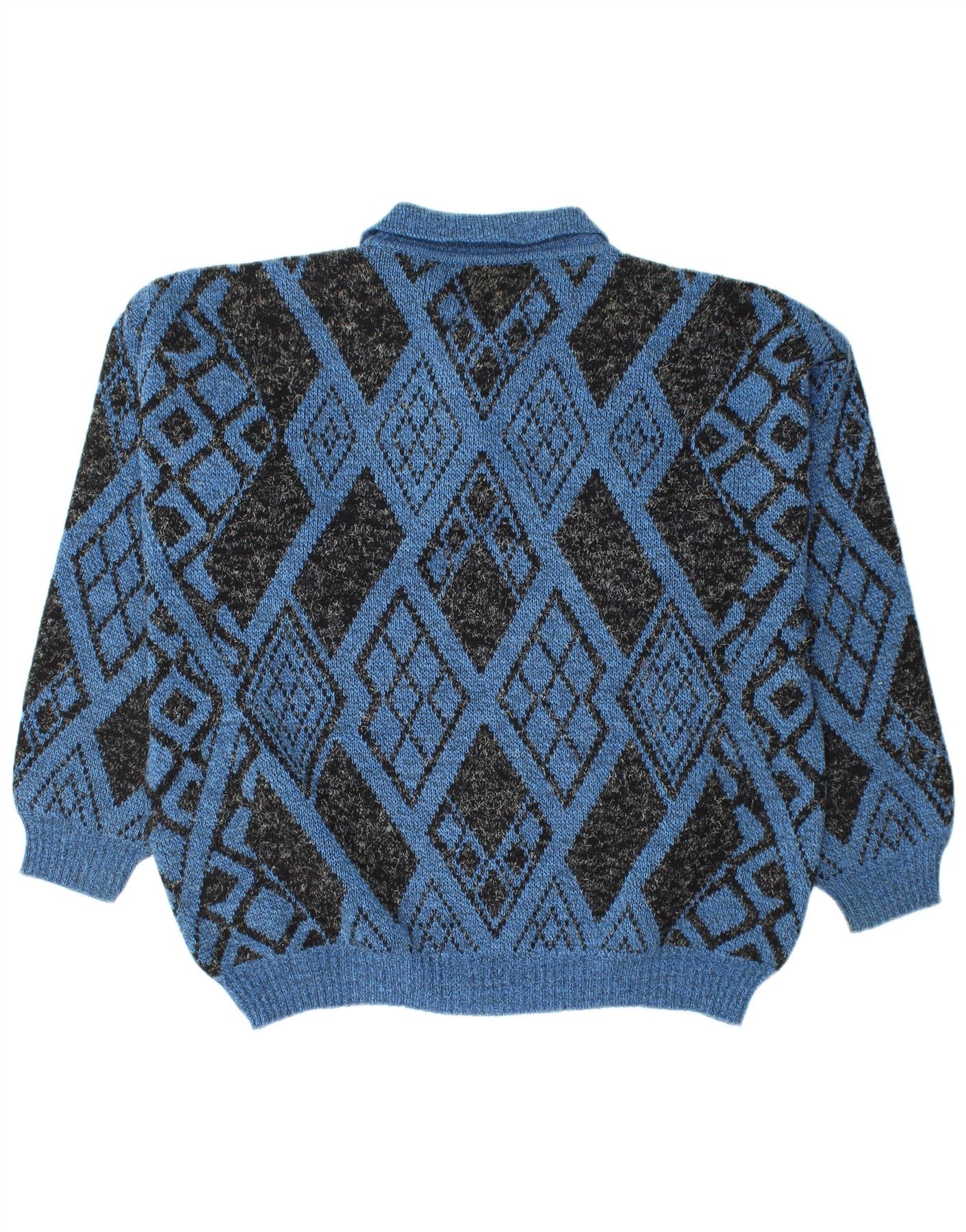 VINTAGE Hombres Polo Cuello Jersey Suéter Grande Azul Argyle/Diamante