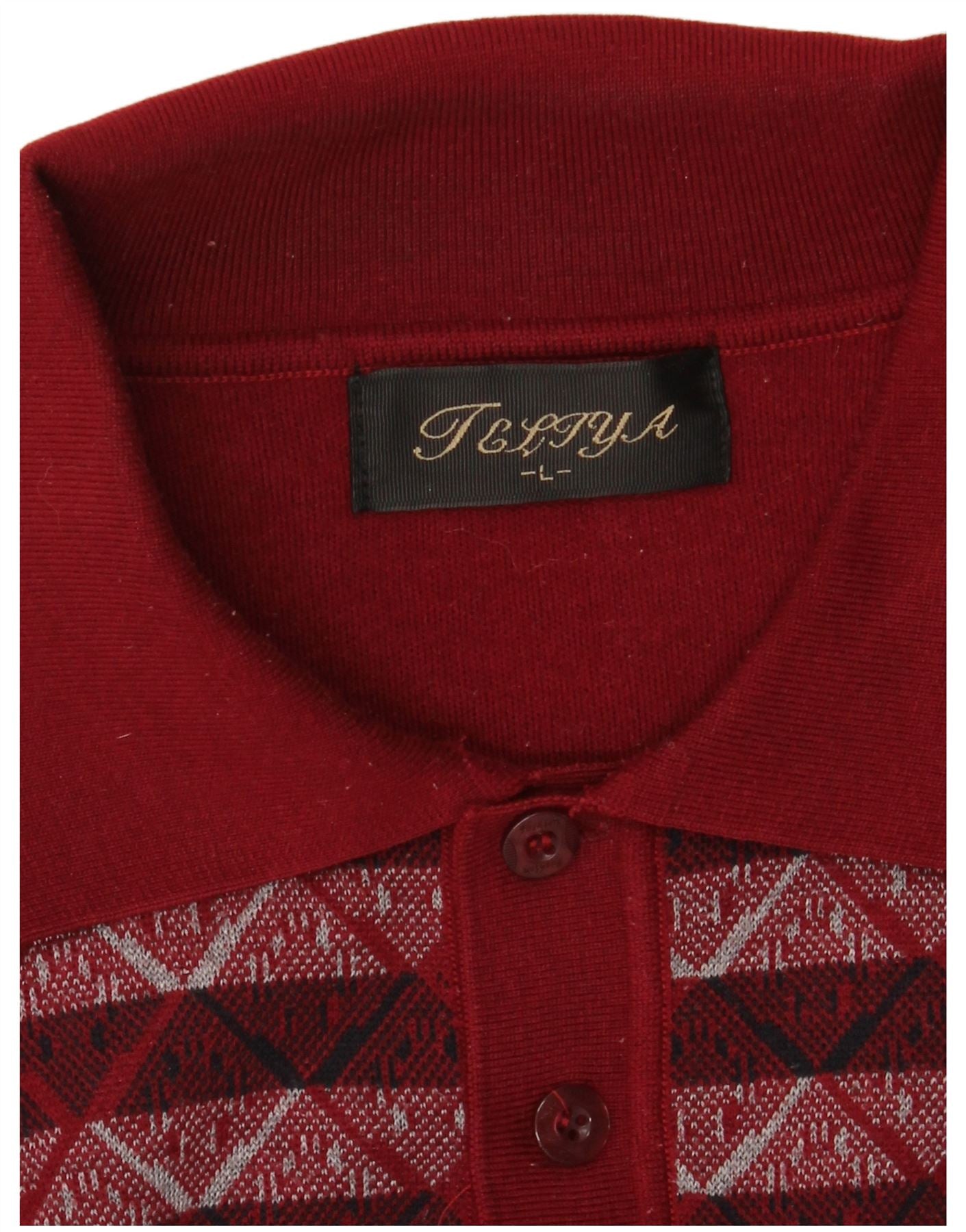 VINTAGE Hombres Polo Cuello Jersey Suéter Grande Borgoña Geométrico