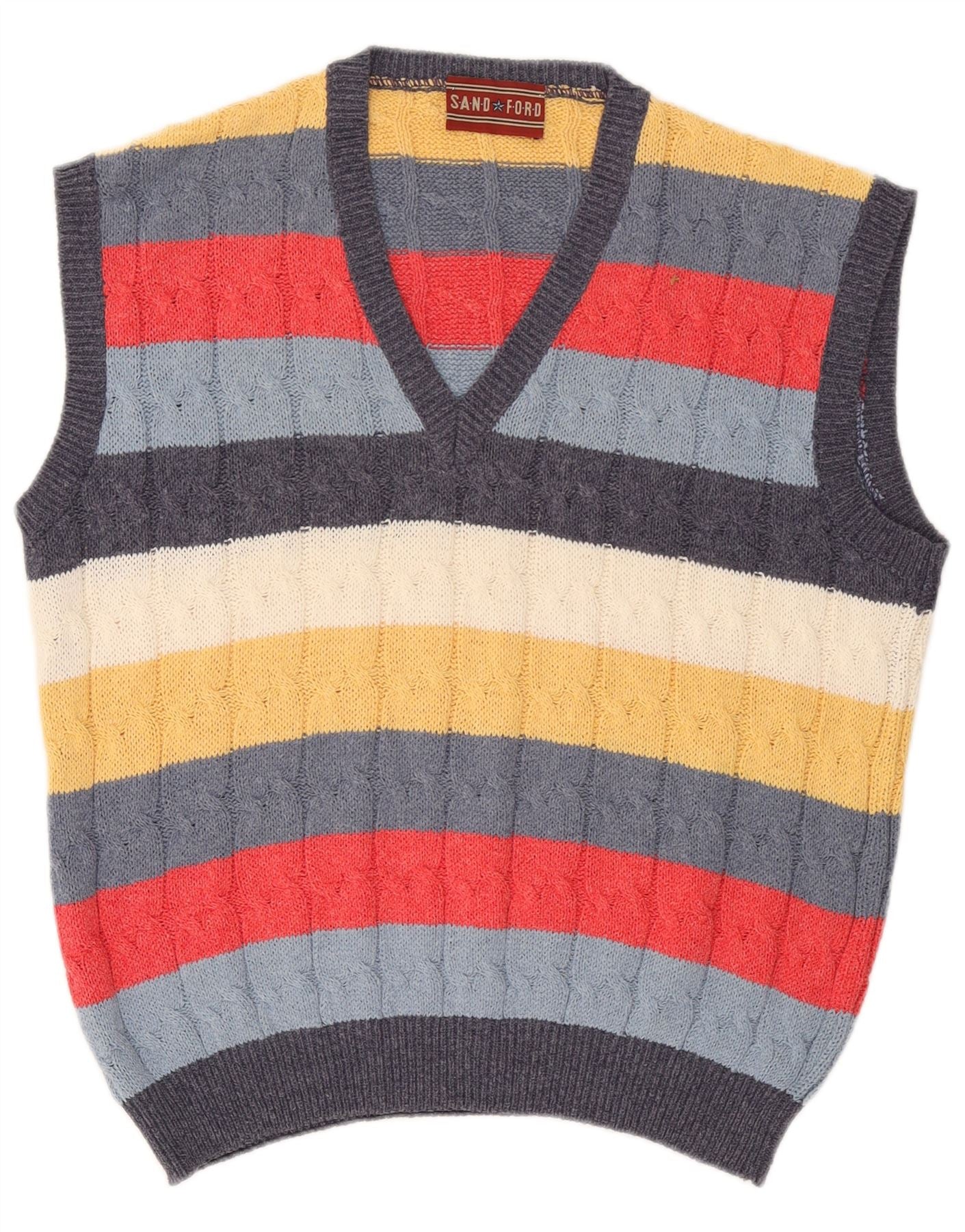- Descripción de IA: Este suéter tipo jersey con cuello en V de Sandford para hombre está confeccionado con una suave mezcla de punto acrílico de algodón. Presenta un atrevido patrón de rayas multicolores con un diseño de punto loco texturizado. El corte sin mangas y el escote en V ofrecen un estilo retro clásico. Su corte regular garantiza un uso cómodo. Este diseño de jersey es perfecto para usar en capas y agrega un toque vibrante a cualquier conjunto.