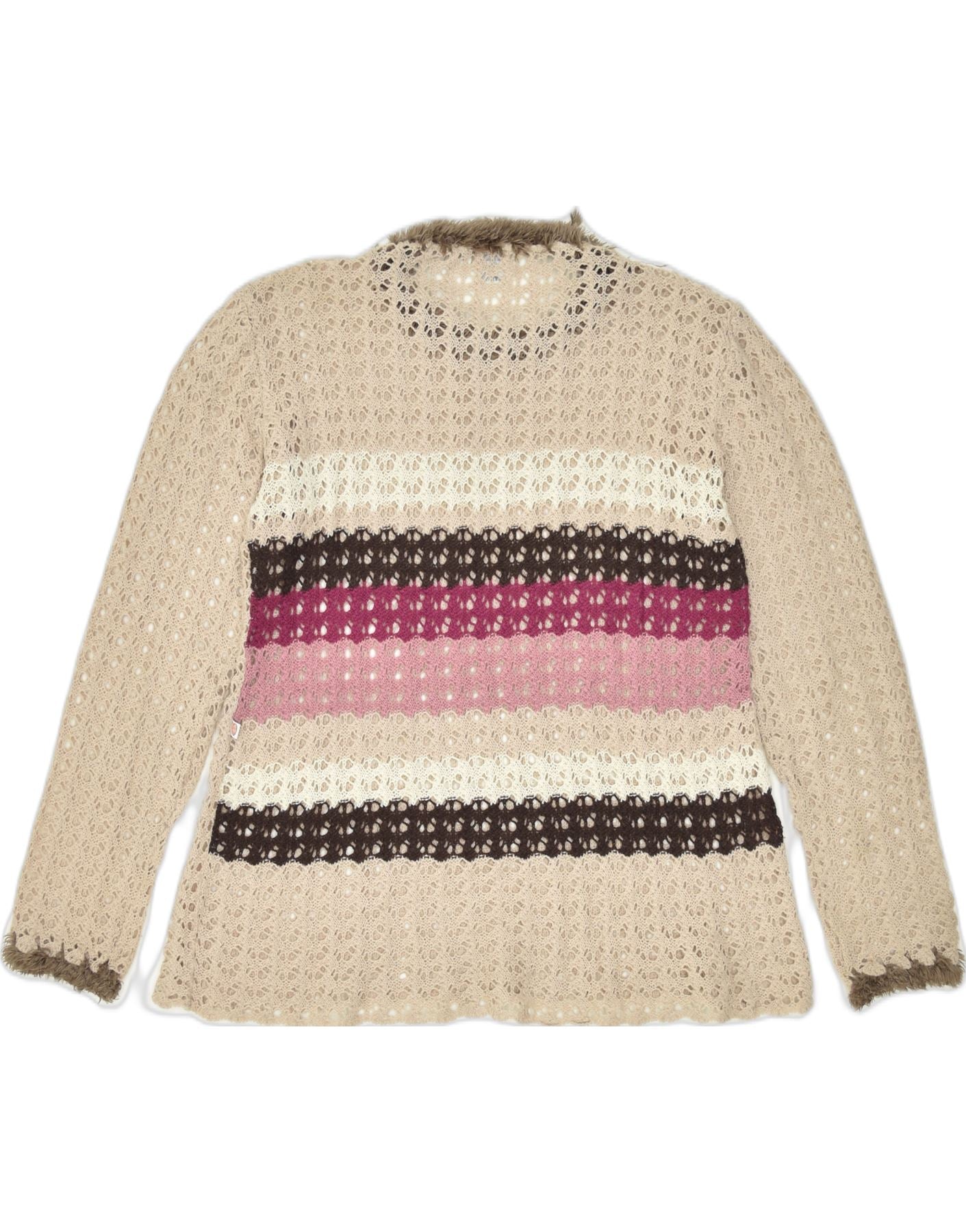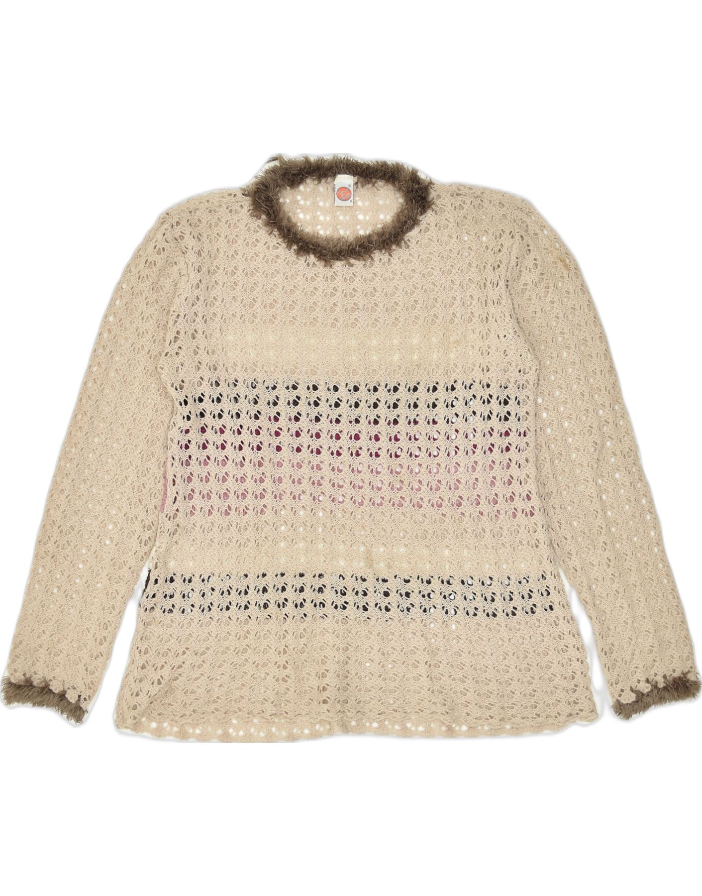 VINTAGE Mujer Ver a través de cuello redondo Jersey suéter Reino Unido 20 2XL Beige Nylon