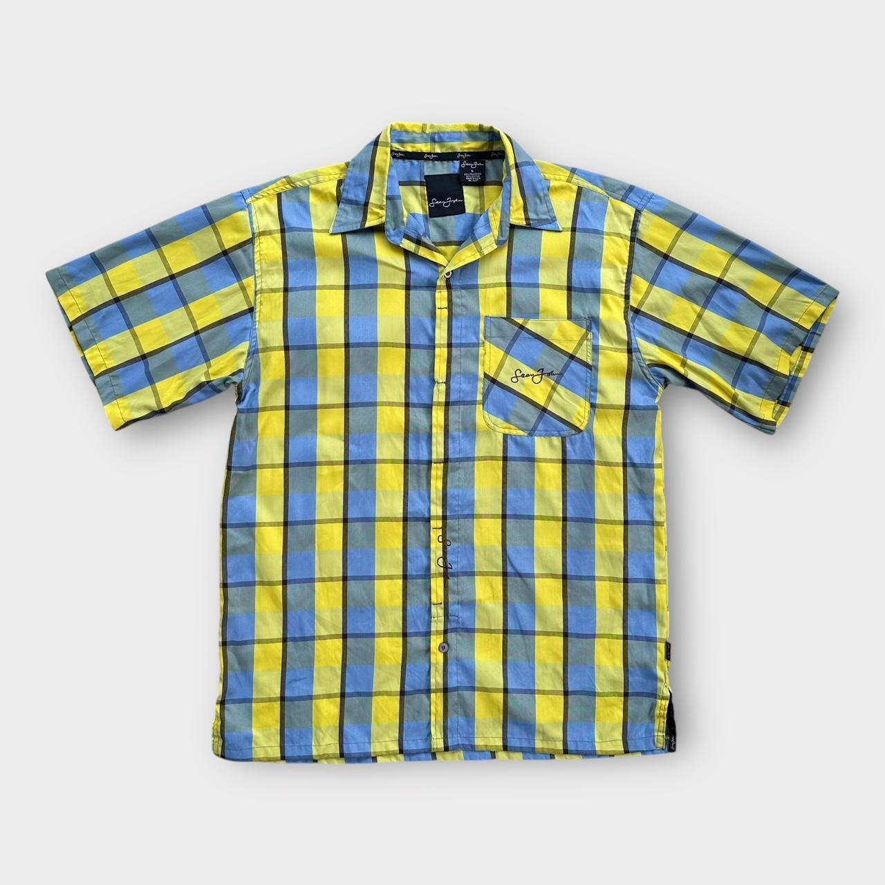 VINTAGE Camisa de patrón abstracto para hombre XL Rayón azul