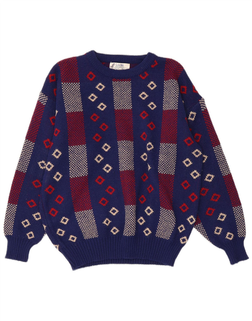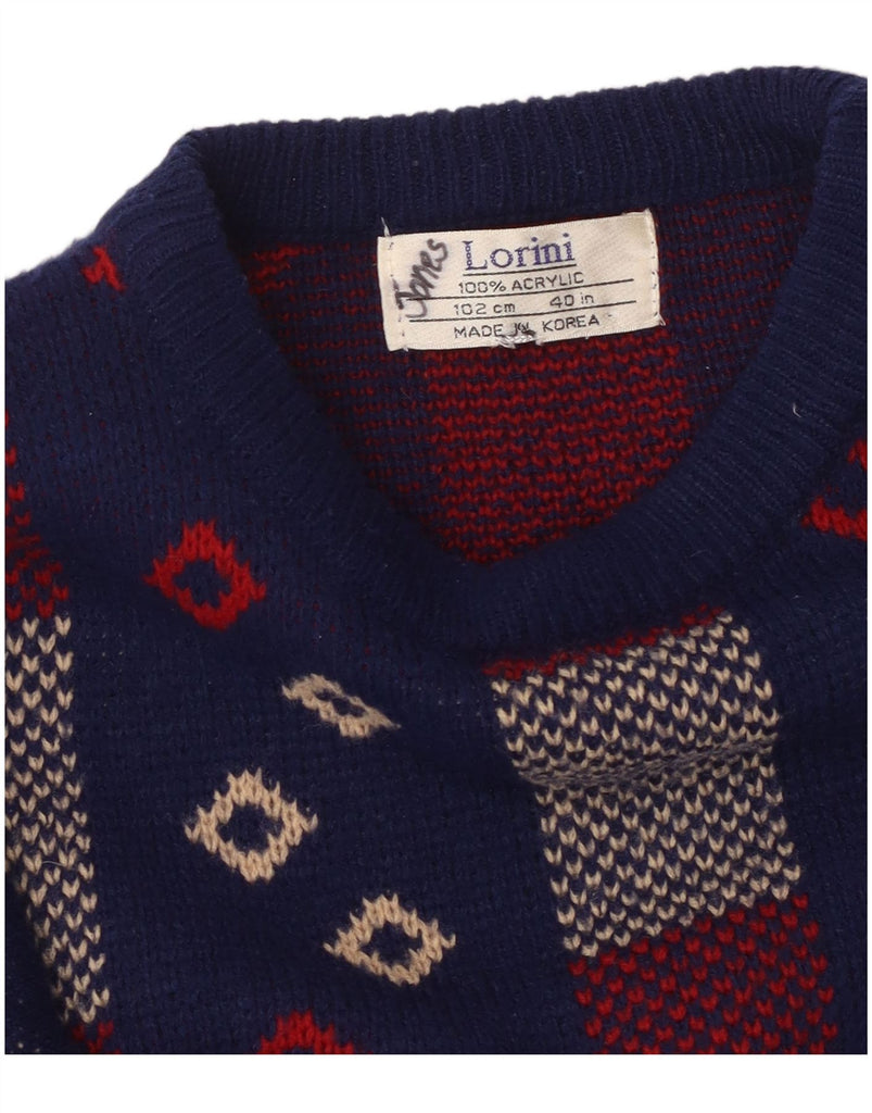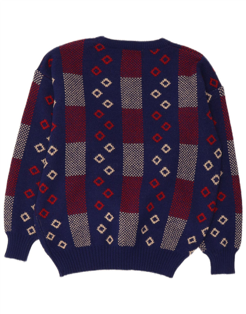 VINTAGE Mujer Barco Cuello Jumper Suéter Reino Unido 14 Medio Azul Marino Geométrico