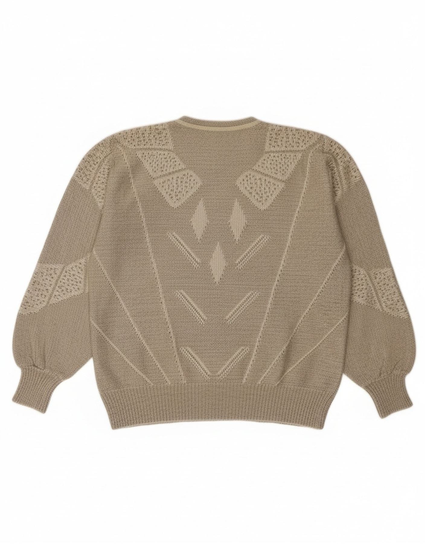 - Descripción de IA: Este suéter vintage con cuello y cremallera para mujer está confeccionado con un tejido de punto beige. Presenta un corte relajado de murciélago y mangas largas. El escote redondo incluye un práctico detalle de cremallera. Un llamativo patrón geométrico adorna el cuerpo y las mangas. Este estilo retro ofrece elasticidad y comodidad, lo que garantiza un uso cómodo y elegante.