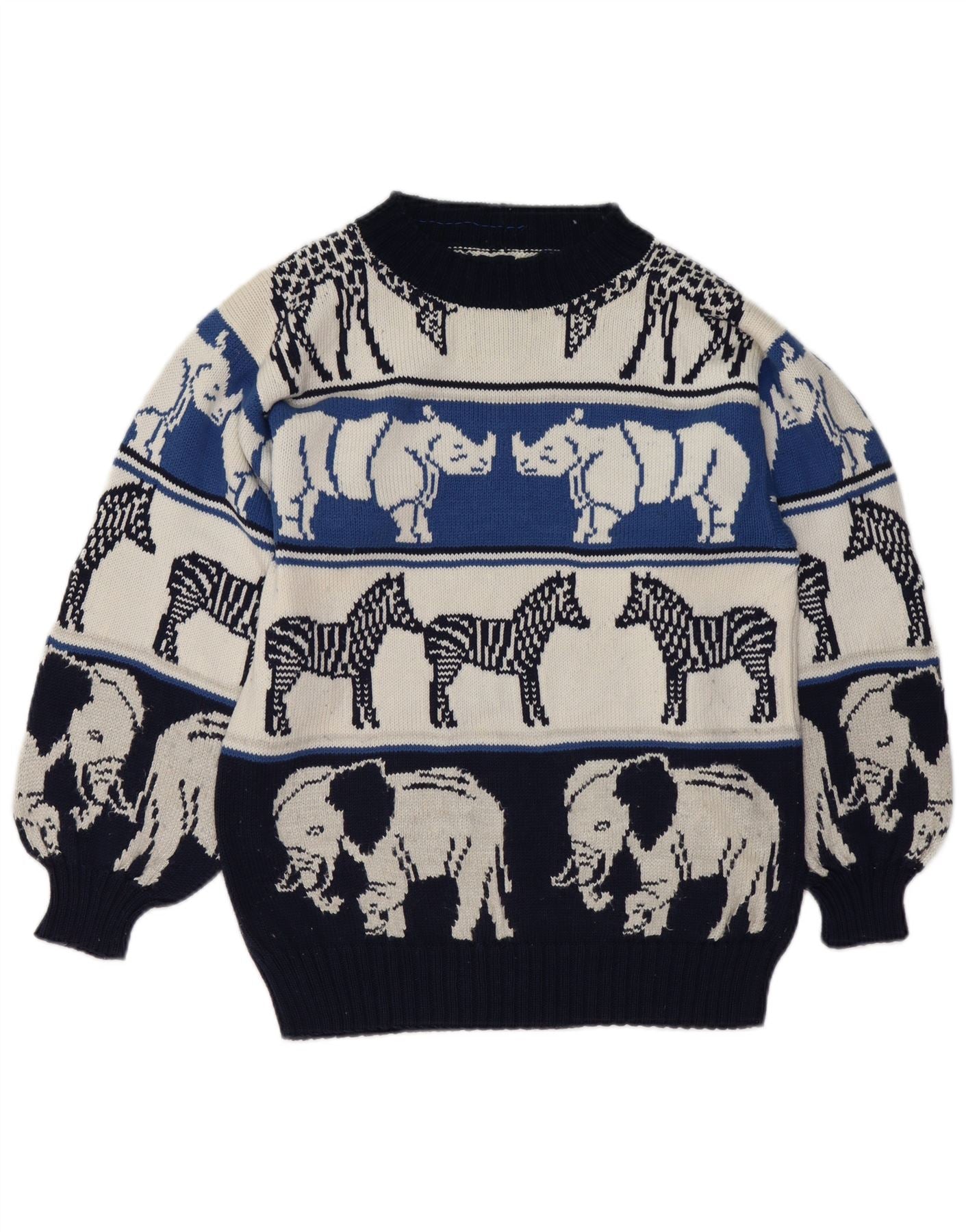 VINTAGE suéter de cuello redondo para mujer Reino Unido 18 XL estampado animal azul marino