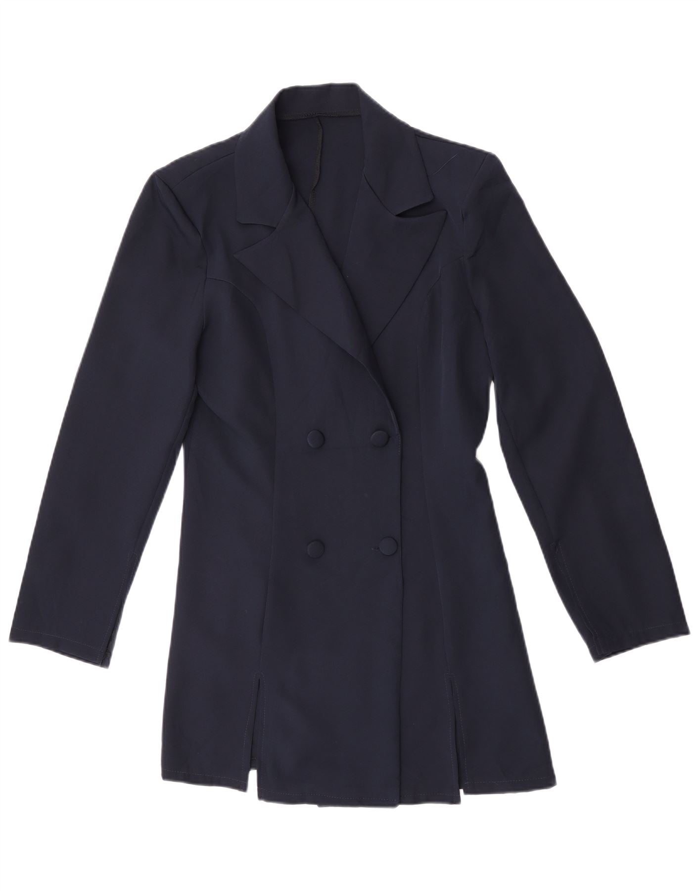 Vintage mujer doble pecho abrigo Reino Unido 14 medio azul marino poliéster