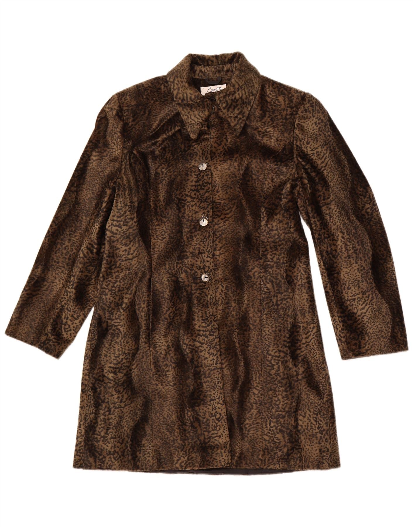 VINTAGE Abrigo de piel sintética para mujer Reino Unido 14 Poliéster con estampado animal marrón medio