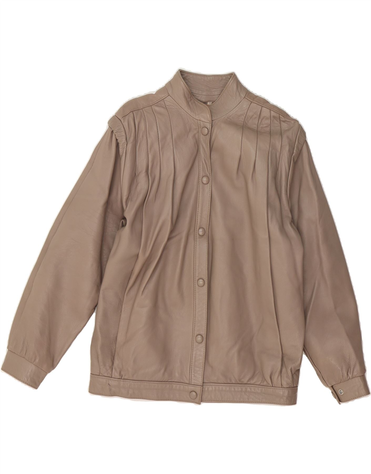 - AI Description: This classic, pre-owned vintage bomber jacket for women is crafted from beige leather and features a collared neckline and long sleeves. The jacket has a regular fit, button closure, and is lined with shoulder pads. Accented with buttons, this UK-made size 14 jacket shows minor general discoloration and visible wear, but remains in excellent condition. Perfect for adding a touch of classic style to any outfit.
