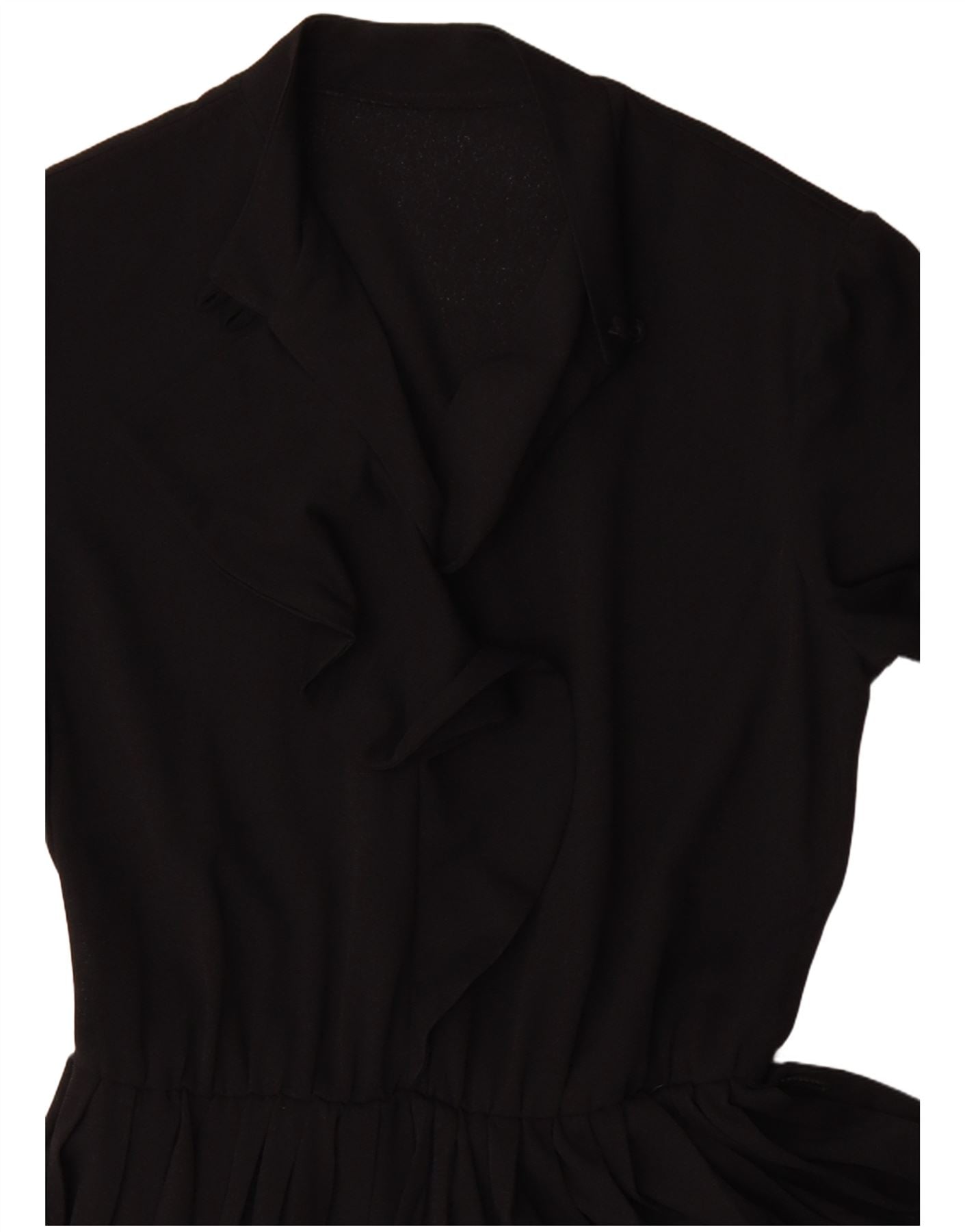 - Descripción de IA: Este vestido vintage para mujer está confeccionado con un tejido negro. Presenta escote con cuello y mangas largas para una cobertura elegante. El diseño del jersey incluye un detalle de volantes en el corpiño. Una cintura elástica define la silueta, dando lugar a una falda plisada clásica. Este vestido de corte regular ofrece un look estructurado y atemporal. El detalle de volantes añade un toque de encanto femenino, perfecto para un conjunto sofisticado.