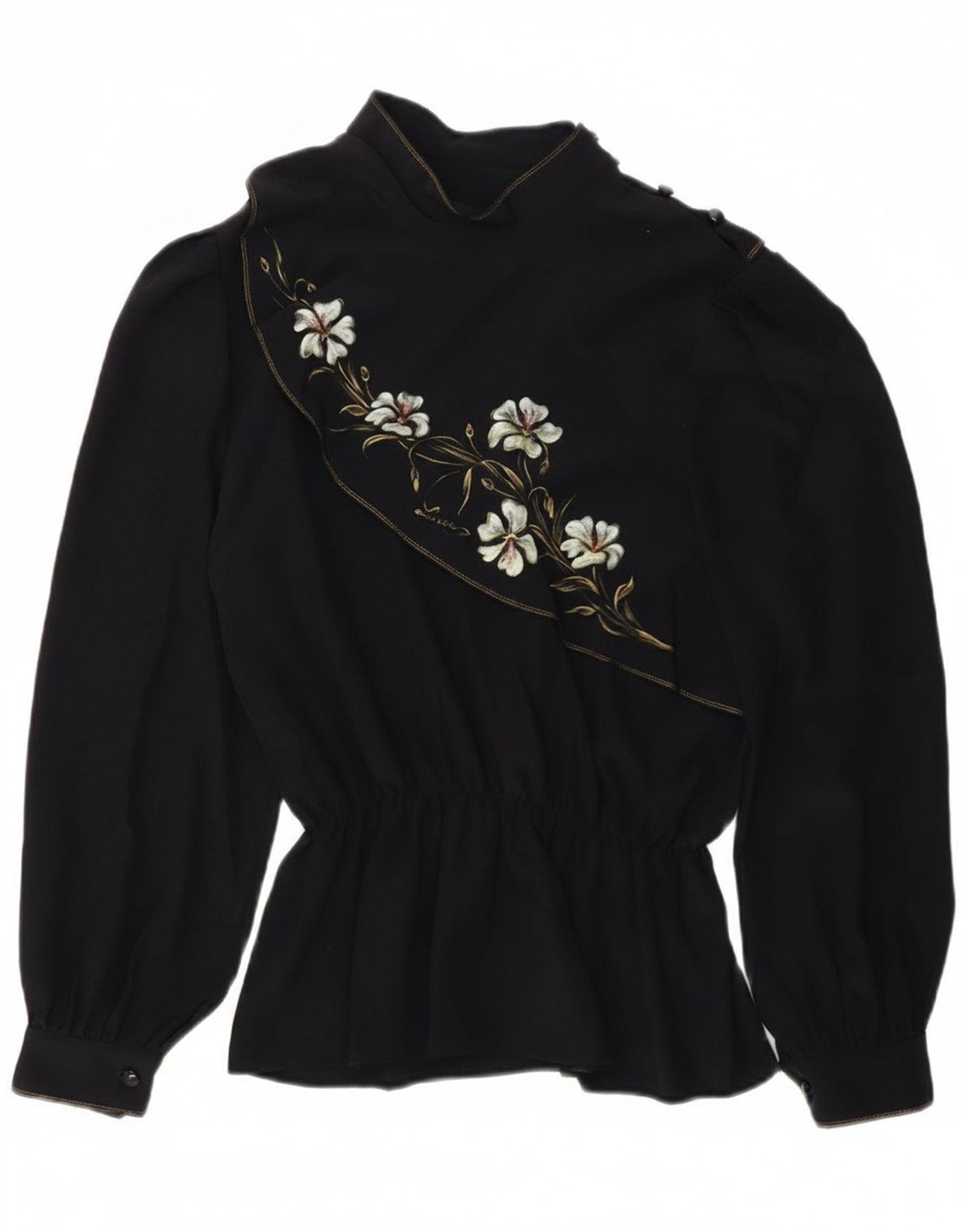 - Descripción de IA: Esta blusa vintage para mujer está confeccionada con un tejido negro. Presenta cuello alto y mangas largas con detalle de puños. El ajuste relajado pasa a un dobladillo peplum con cintura elástica. Un elegante estampado floral bordado adorna la parte delantera, añadiendo un toque gráfico sofisticado. Los cierres de botones completan el diseño.