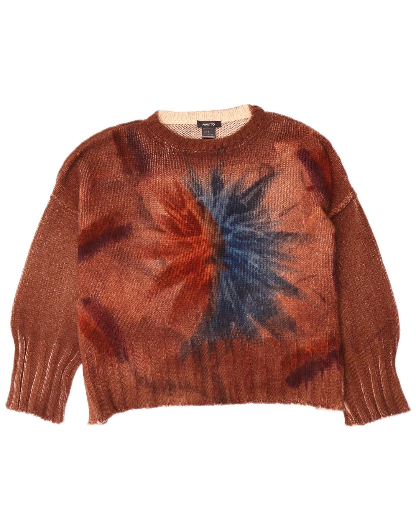 - Descripción de IA: Este suéter tipo jersey para mujer de Avant Toi está confeccionado con un tejido de punto ligero. Presenta un llamativo patrón de teñido anudado en tonos marrón, naranja y azul. El clásico cuello redondo y las mangas largas ofrecen un ajuste cómodo y regular. Los puños y el dobladillo de canalé proporcionan una estructura sutil. Este diseño de jersey es cómodo y elegante, perfecto para una estética retro.
