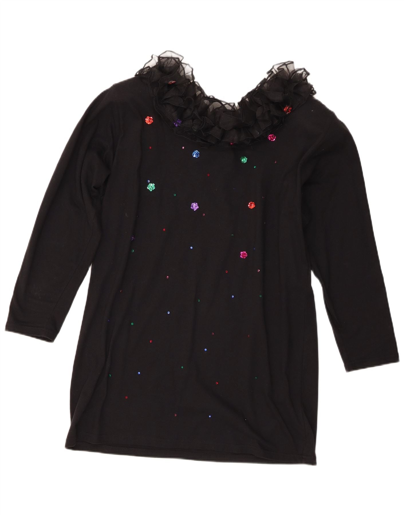 Vintage mujer volante frente manga larga túnica Top Reino Unido 16 algodón negro grande