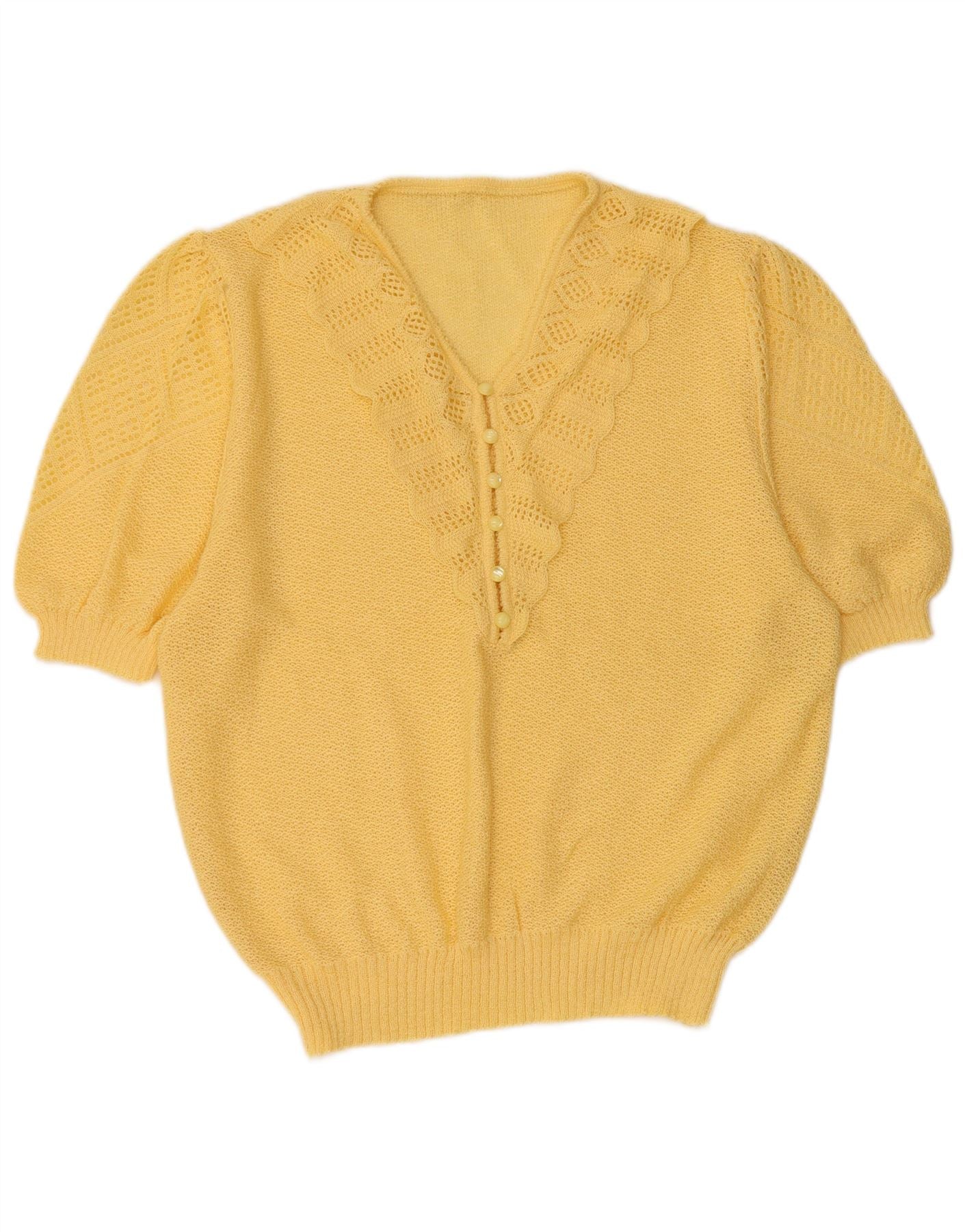 VINTAGE suéter de manga corta con cuello en V para mujer Reino Unido 16 amarillo grande