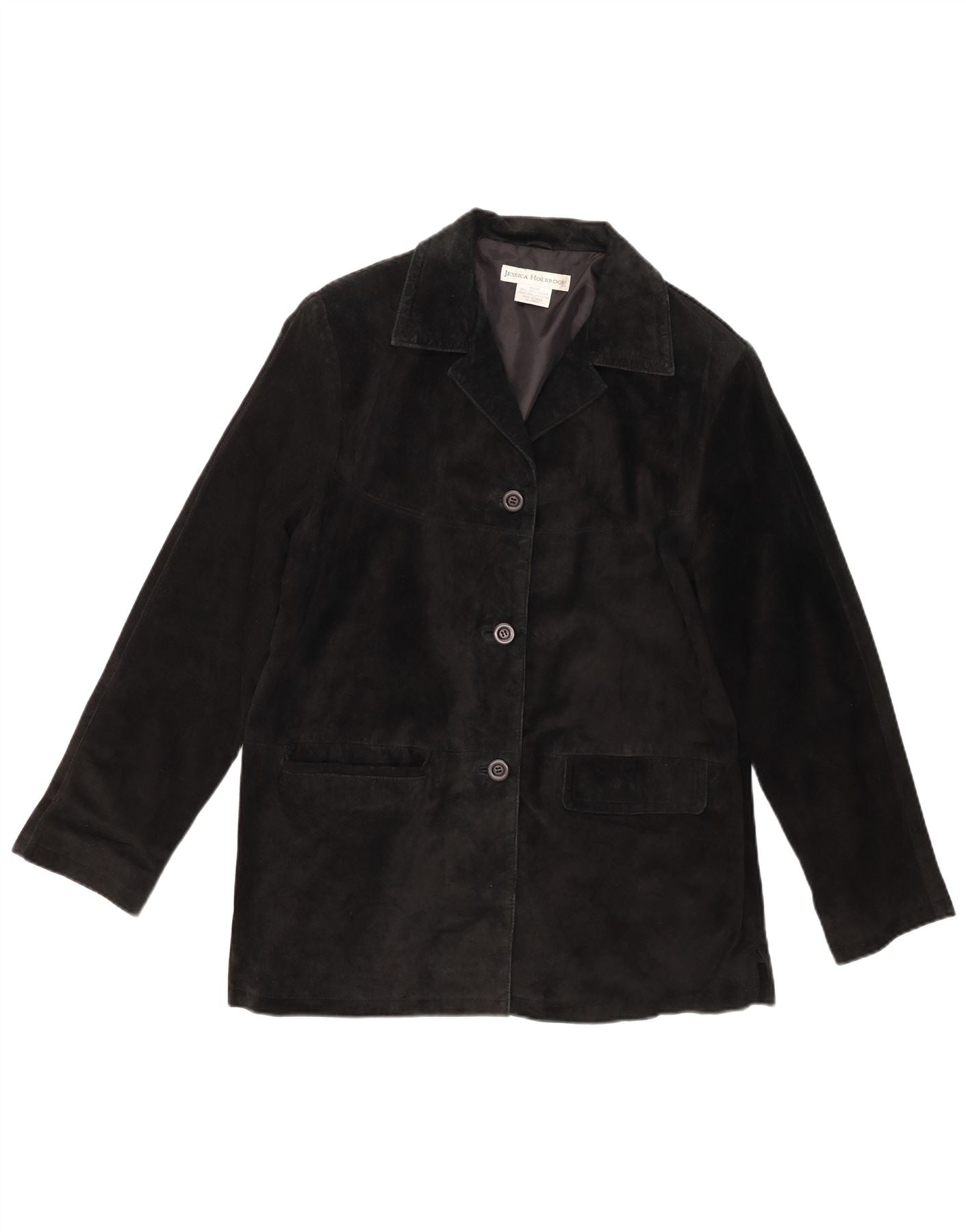 - Descripción de IA: Esta chaqueta de cuero para mujer de Jessica Holbrook está confeccionada con lujosa gamuza negra y ofrece una textura suave y refinada. Presenta un escote de cuello clásico y manga larga. La parte delantera está asegurada con cierres de botones tonales. Dos prácticos bolsillos delanteros añaden funcionalidad. Esta chaqueta está completamente forrada para brindar comodidad y una caída suave. El corte regular garantiza una silueta cómoda y versátil.