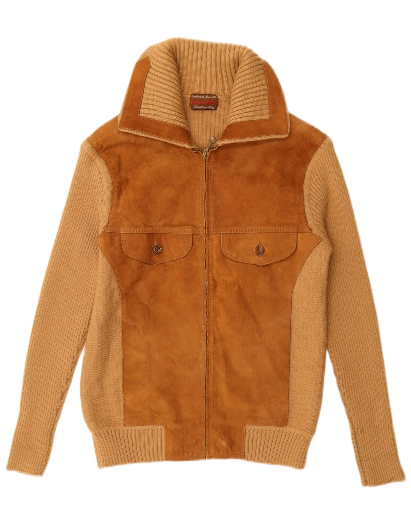 VINTAGE Suéter cárdigan de ante para mujer Reino Unido 12 Bloque de color beige medio