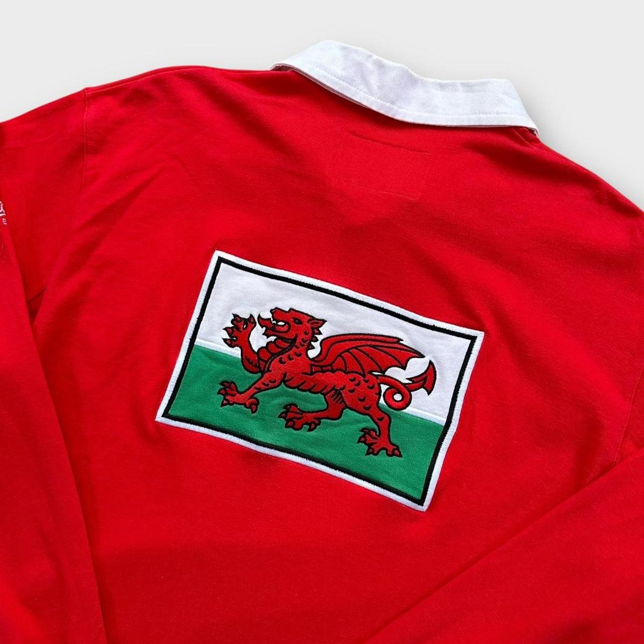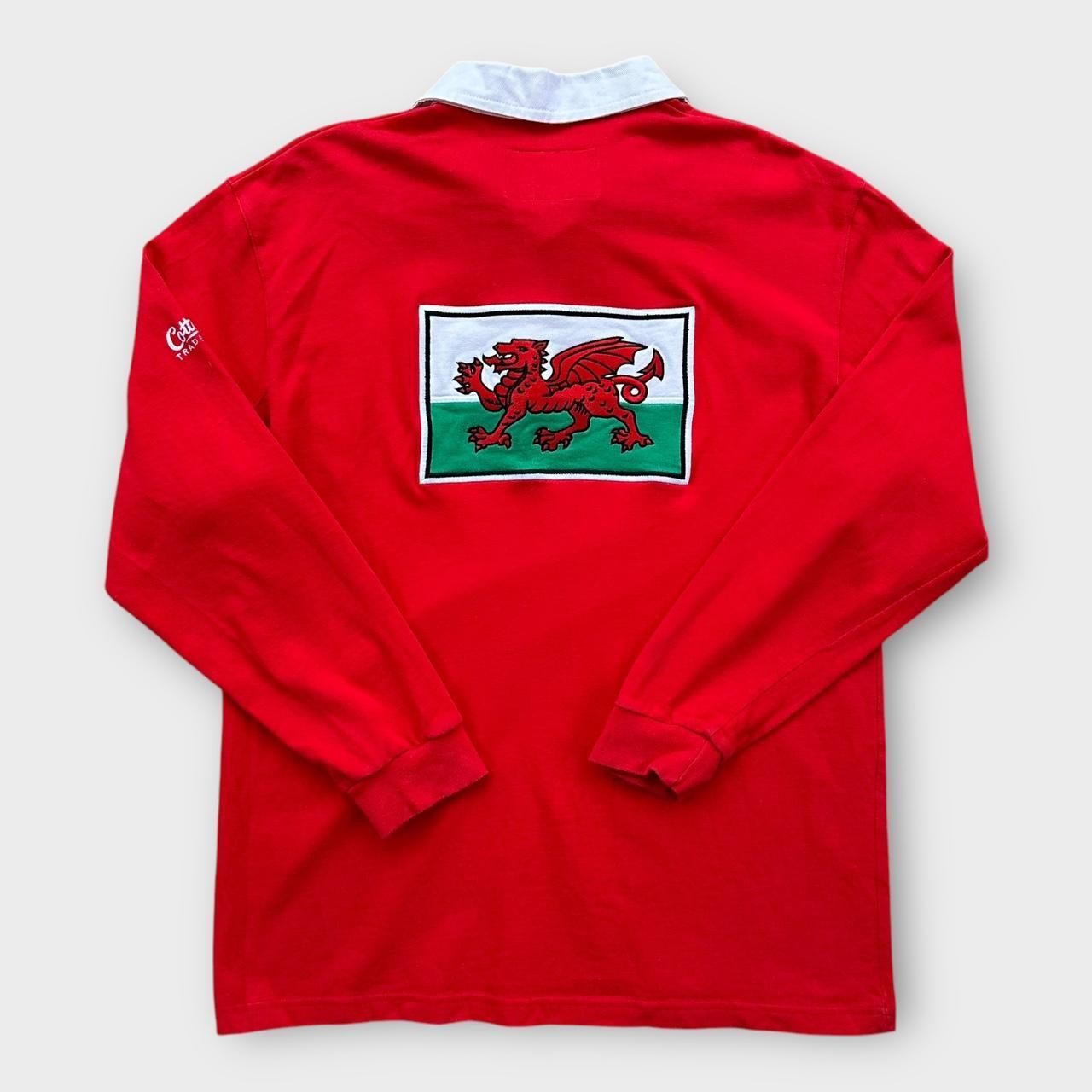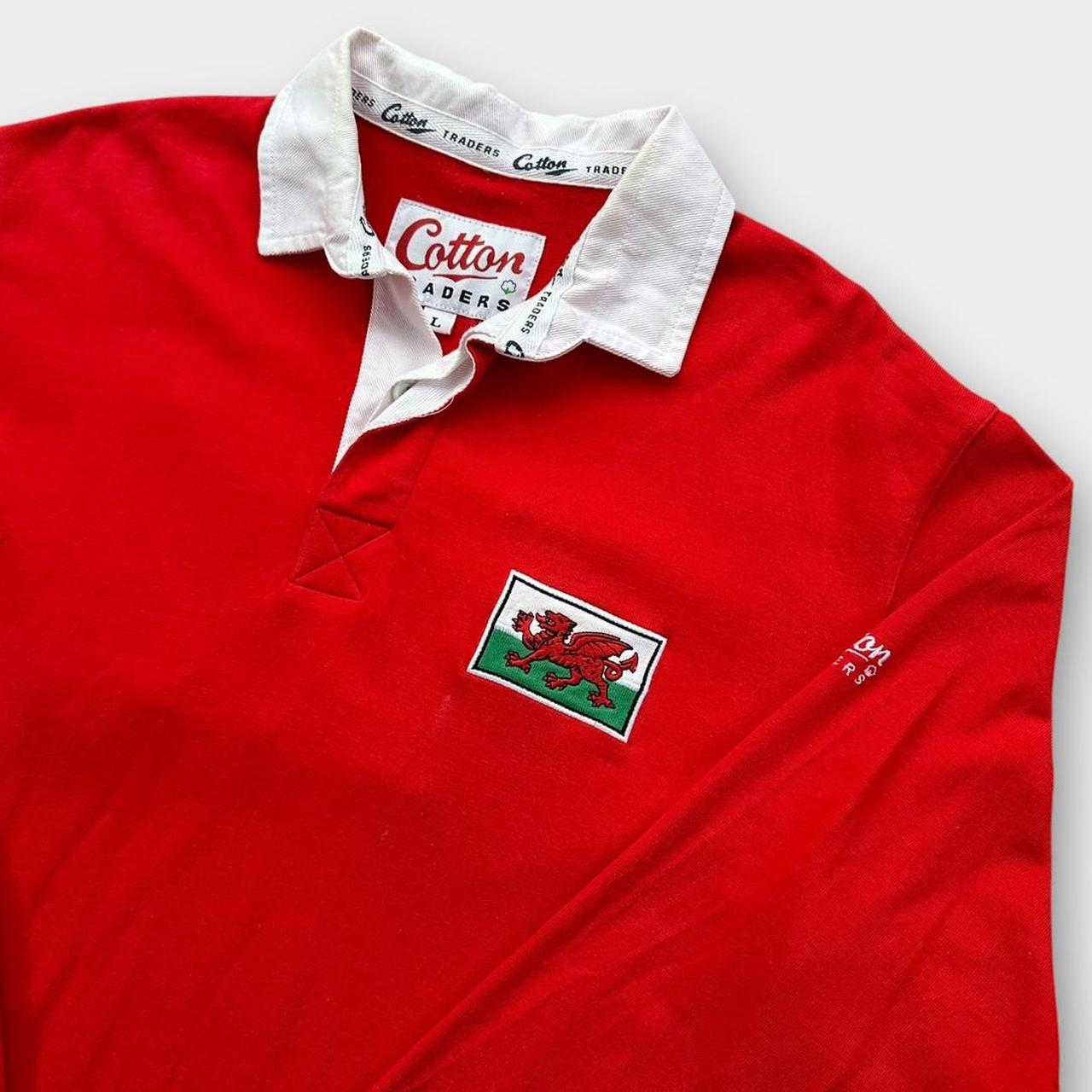 Camiseta de rugby de Gales vintage de los años 90 de comerciantes de algodón en rojo y blanco con logotipos bordados en el pecho y la espalda