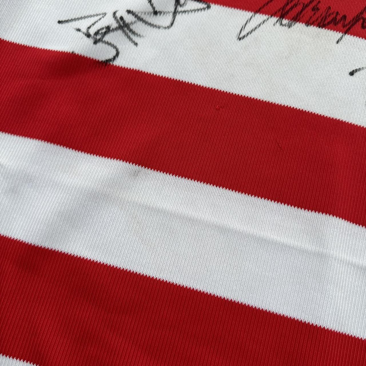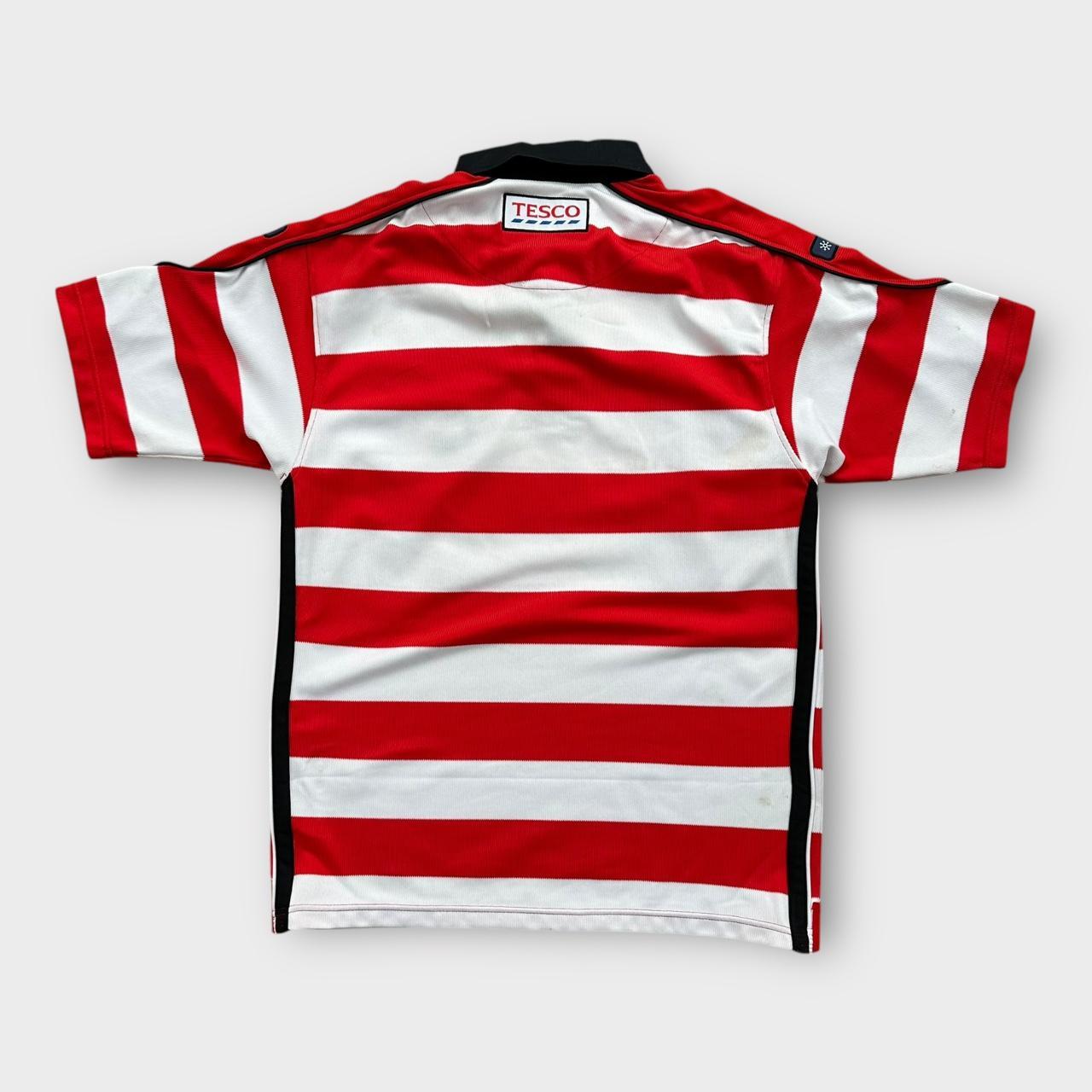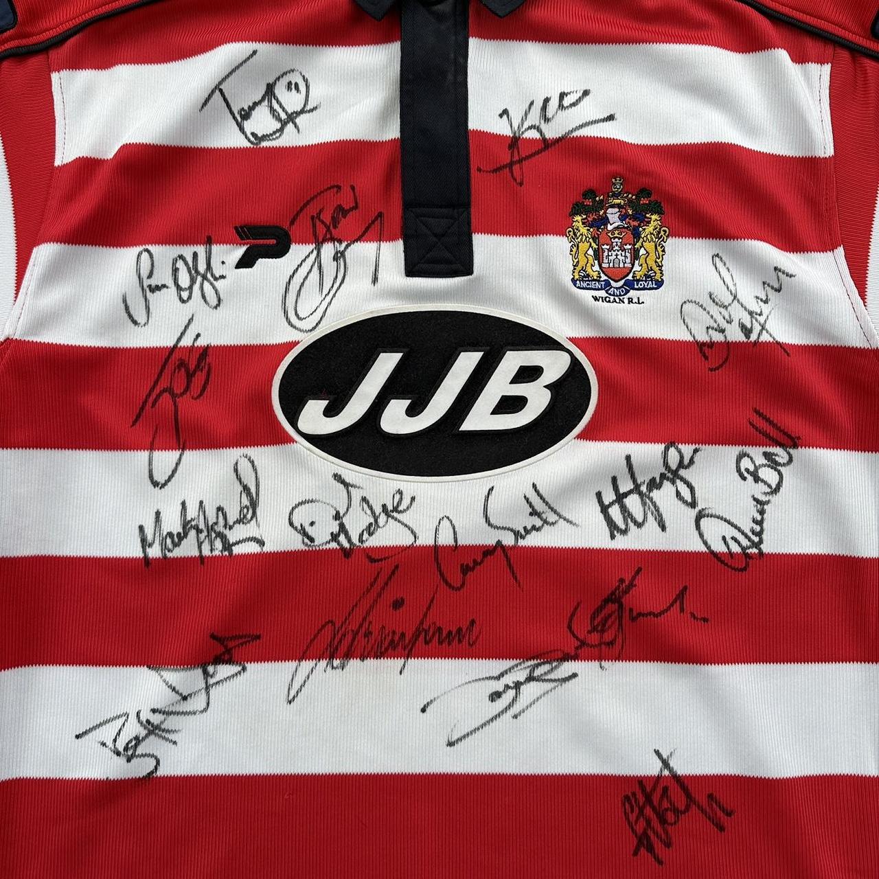 Camiseta de rugby vintage 2003-2004 de los Wigan Warriors firmada en rojo y blanco por Patrick con el clásico patrocinador de JJB en el pecho.