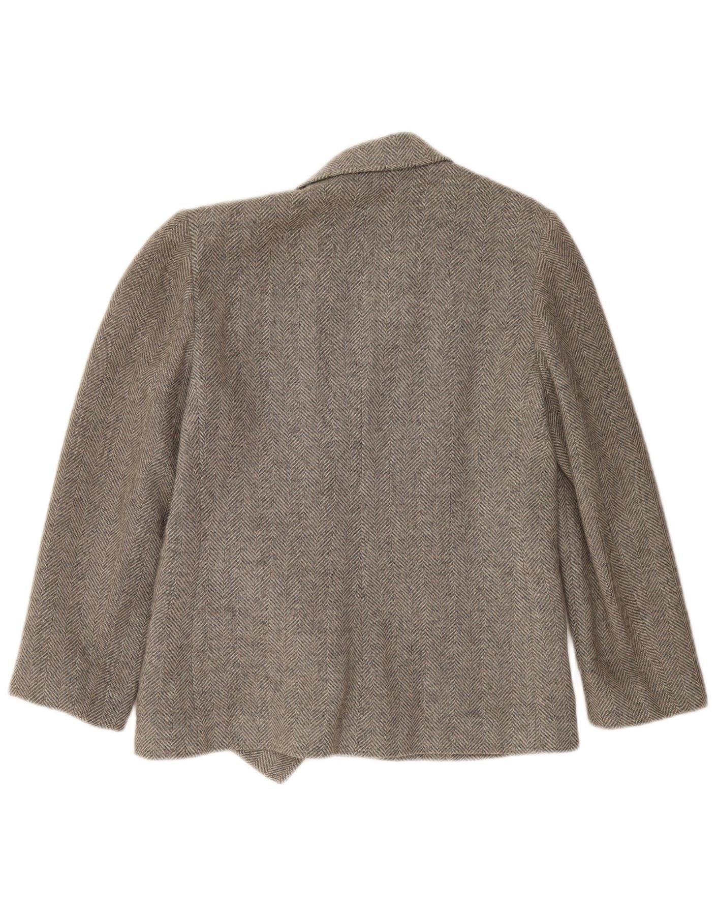 - Descripción de IA: Esta chaqueta tipo blazer Vintage para mujer está confeccionada con una mezcla de lana gris y presenta un distintivo patrón de espiga. Presenta un escote de cuello clásico y un frente cruzado con cierre de botón. Las mangas largas y el corte regular garantizan comodidad y un estilo atemporal. El diseño incluye prácticos bolsillos y un forro completo, aportando un acabado refinado y pulido.