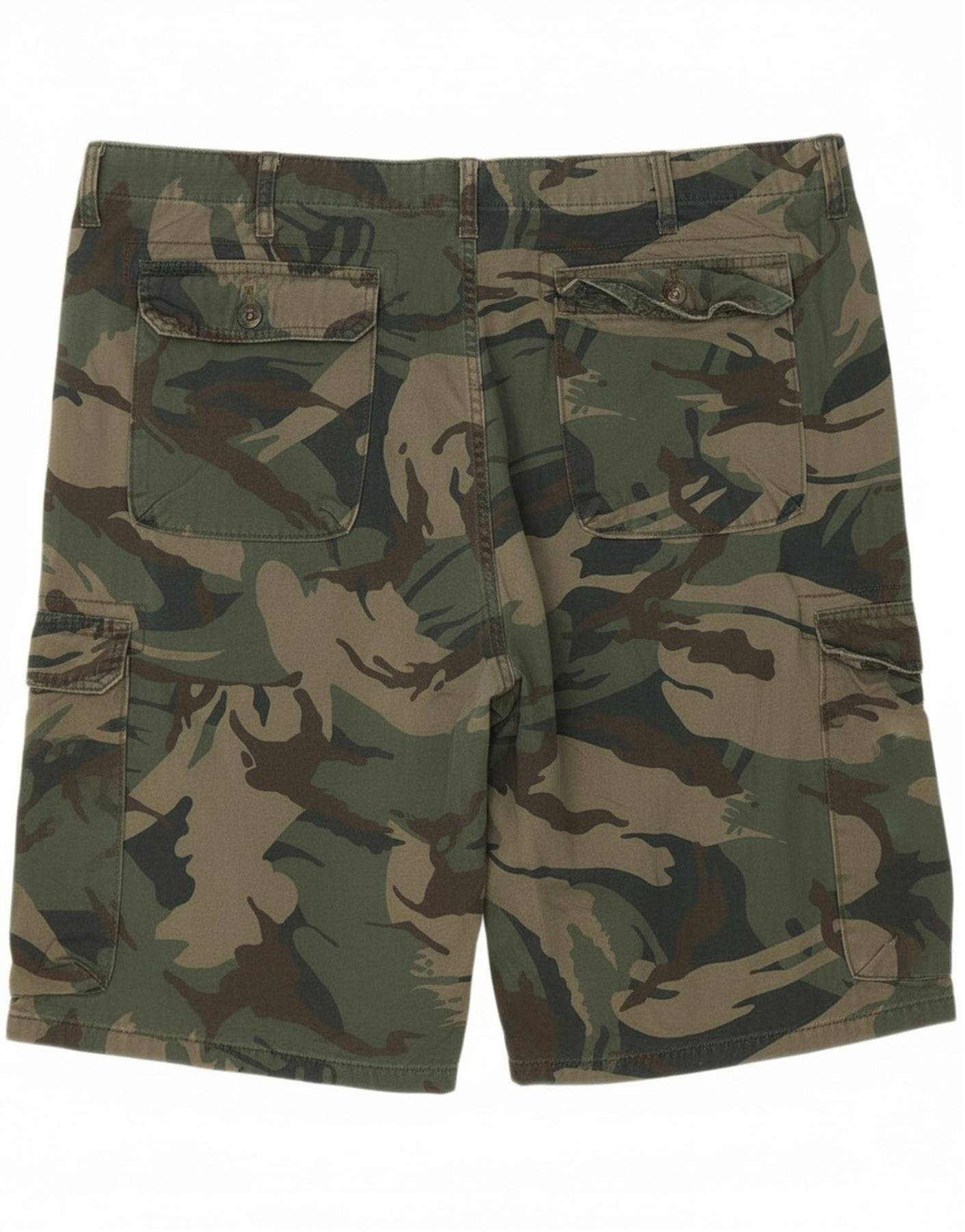 - AI Description: This Wrangler mens cargo shorts are crafted from a durable 100 percent cotton woven fabric. The striking camouflage pattern features a blend of green, brown, and khaki tones. They boast a relaxed fit, ensuring comfort and freedom of movement. A button and zip closure provides a secure fastening. Multiple utility pockets add practical detail and an army inspired style.