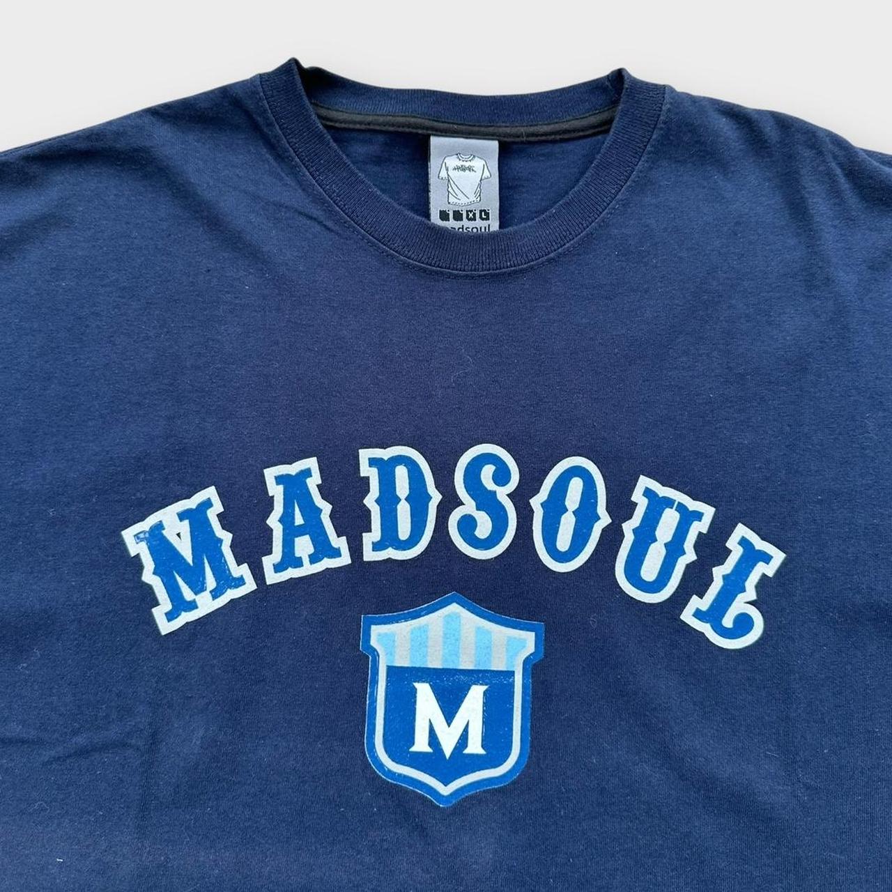 Camiseta vintage con gráfico de hip hop Y2K Mad Soul de principios de 2000 en azul marino con hechizos en el pecho