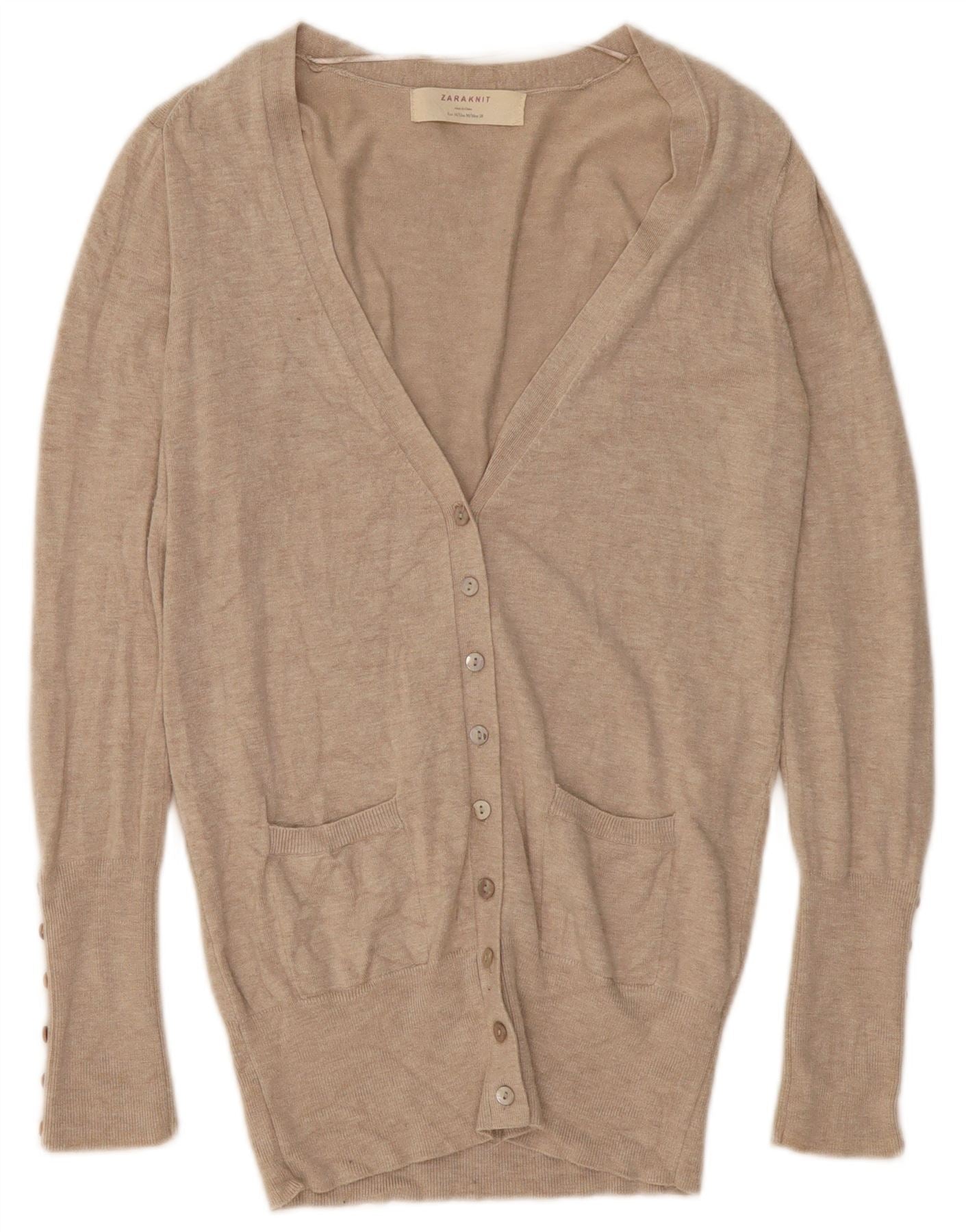 - Descripción de IA: Este suéter tipo cárdigan de Zara para mujer está confeccionado con un suave punto de mezcla de rayón beige. Presenta un clásico escote en V y manga larga. Los botones tonales aseguran el cierre delantero. El corte regular ofrece comodidad. Dos sutiles bolsillos delanteros añaden detalles prácticos. Pequeños botones adornan los puños para darle un toque refinado. Esta pieza versátil es perfecta para usar en capas.