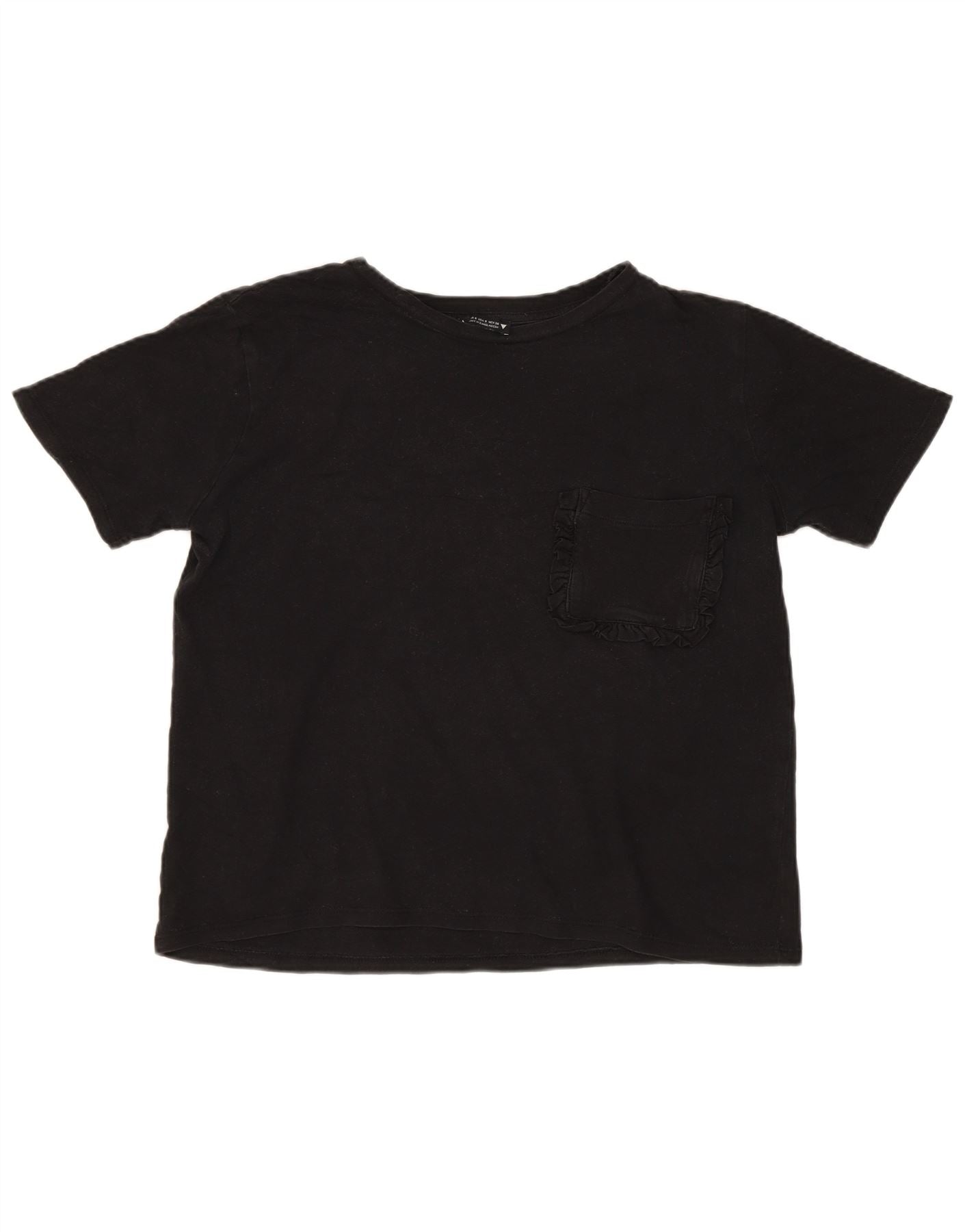 - Descripción de IA: Esta camiseta de Zara para mujer está confeccionada con suave punto de algodón negro. Presenta un clásico cuello redondo y manga corta. El diseño del jersey ofrece un ajuste regular y cómodo. Un sutil detalle de volante detalla el bolsillo delantero, añadiendo un toque moderno. Esta prenda versátil combina comodidad con un estilo discreto para el uso diario.