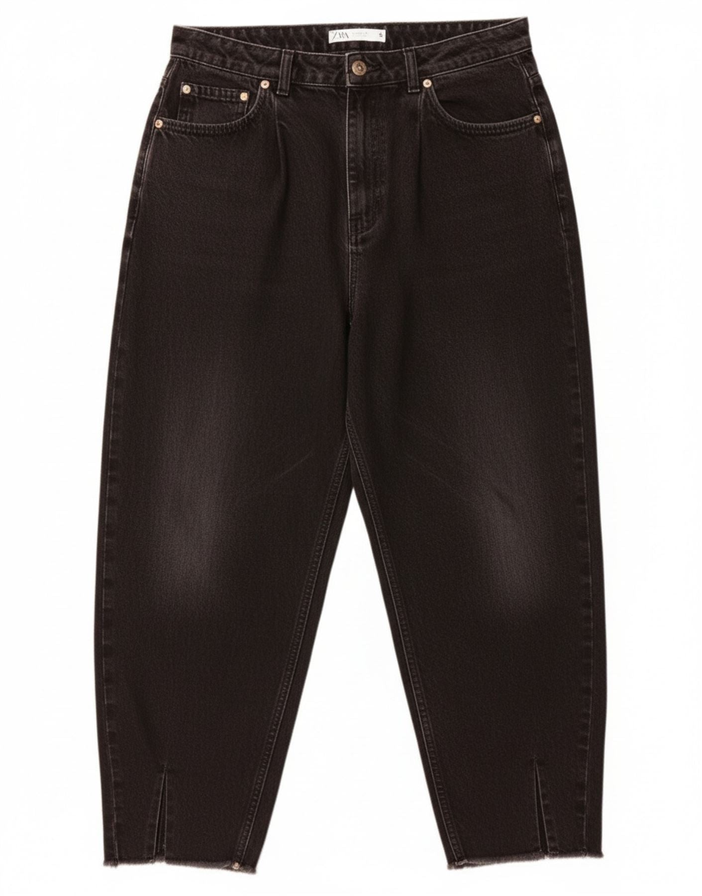 - Descripción de IA: Estos vaqueros de cintura alta de Zara para mujer están confeccionados en denim negro con un acabado desgastado. Tienen cintura alta y cierre de botón. El ajuste relajado a través de la cadera se estrecha hacia el tobillo. Se incluyen prácticos bolsillos. Un logotipo sutil de la marca añade un toque distintivo. El estilo de los 90 se hace evidente en el corte.