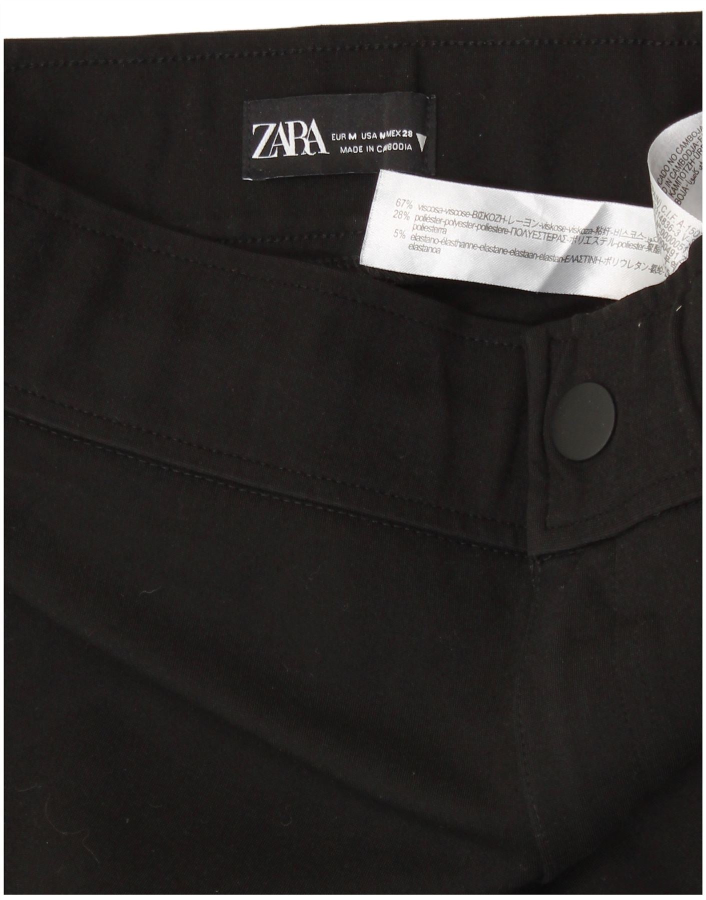 - Descripción de IA: Estos pantalones de mujer de Zara están confeccionados con tejido con elasticidad adicional. El diseño de corte entallado presenta un cierre sin cordones y cintura elástica para mayor comodidad. Estos pantalones negros tienen una silueta elegante. También cuentan con prácticos bolsillos. La composición del material es 67% Viscosa, 28% Poliéster y 5% Elastano.