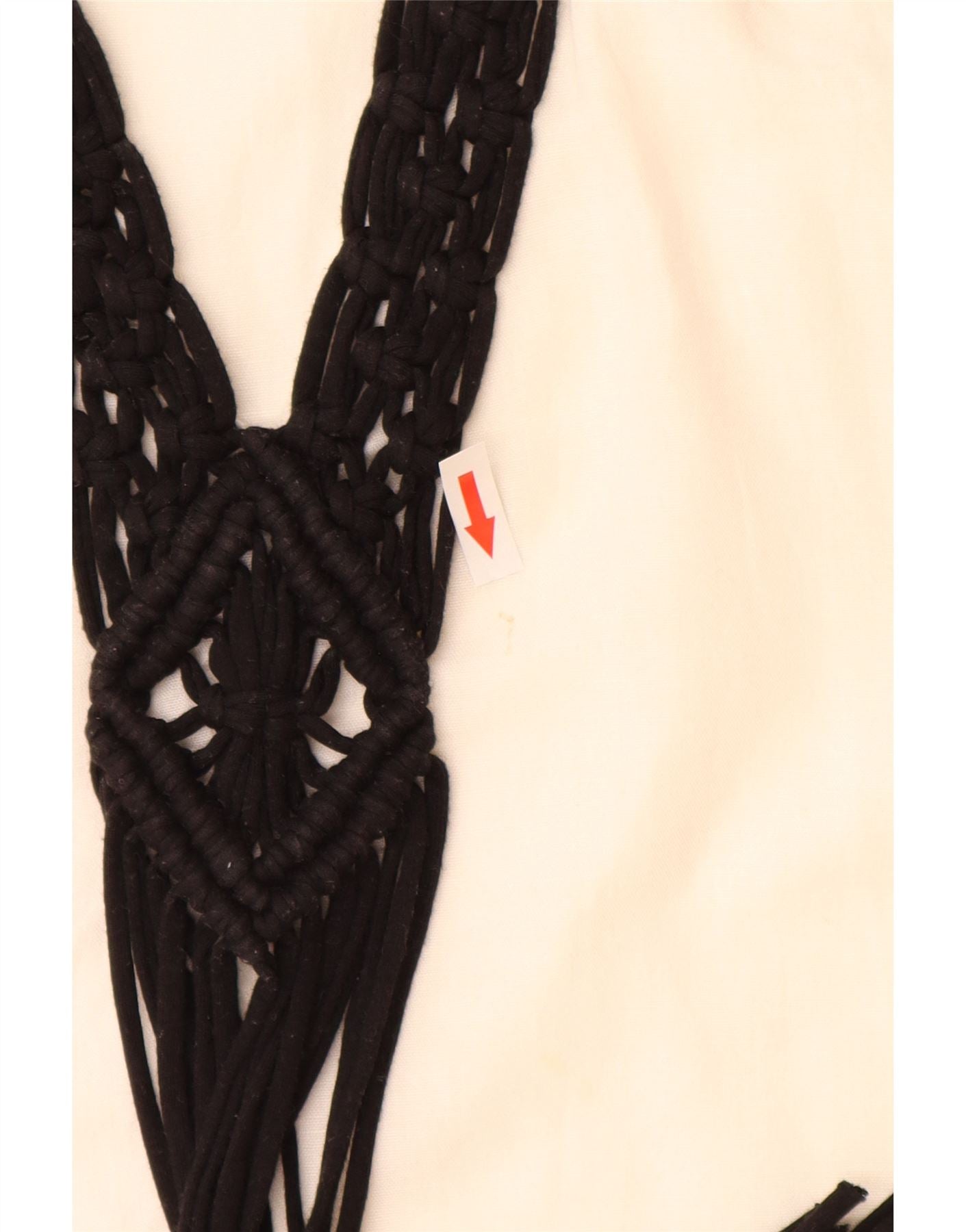 - Descripción de IA: Esta blusa para mujer de Zara está confeccionada con un tejido ligero de color blanco roto. Presenta escote en pico y diseño sin mangas. Un llamativo detalle de flecos de macramé negro adorna el escote en pico, añadiendo un toque bohemio distintivo. El estilo jersey y el corte regular ofrecen una silueta cómoda y elegante sin esfuerzo. Esta pieza combina facilidad con detalles únicos.