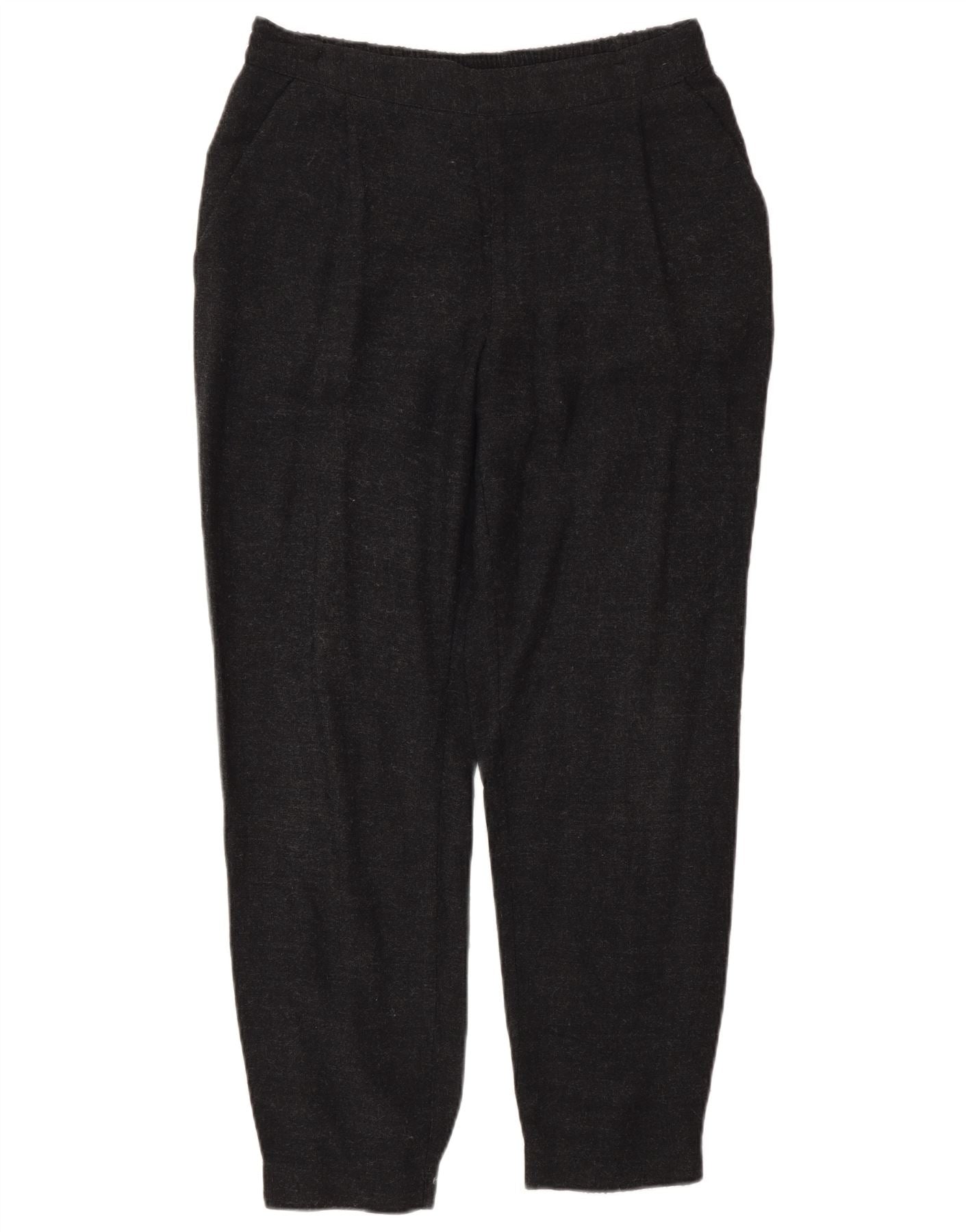 - Descripción de IA: Estos pantalones casual para mujer de Zara están confeccionados con un tejido gris que ofrece una textura cómoda. Presentan un ajuste relajado con una cintura elástica para mayor comodidad. El diseño incluye prácticos bolsillos y un largo recortado. El estilo jogger se completa con dobladillos con puños que aportan una silueta moderna.