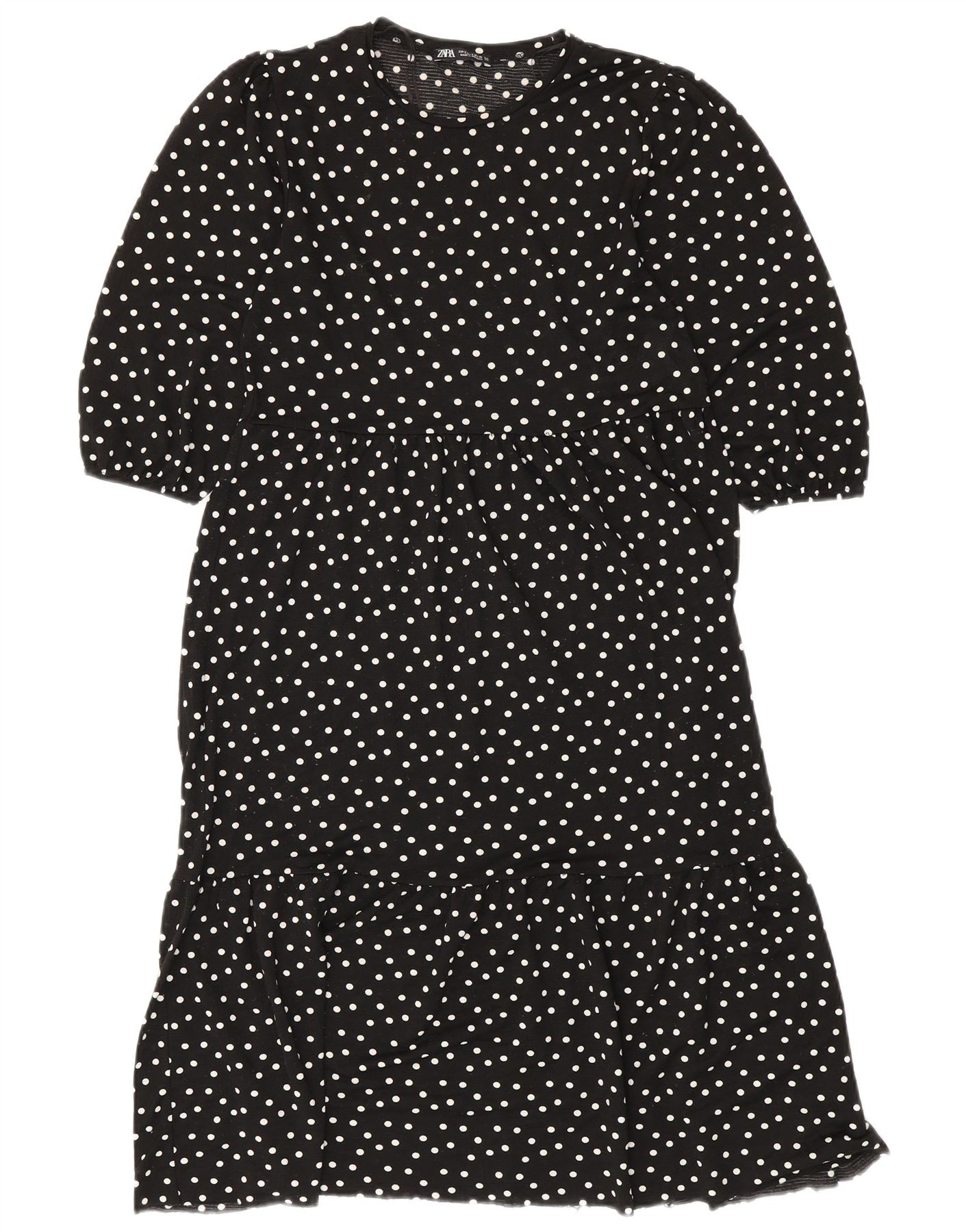 - AI Description: This Zara womens tiered dress is crafted from a lightweight woven polyester blend. It features a classic polka dot pattern on a black base. The round neckline and short sleeves offer a simple silhouette. An empire waist with elastic detailing creates a flattering shape. The maxi length and relaxed fit ensure comfortable wear. Ruffle accents add a feminine touch to this stylish piece.